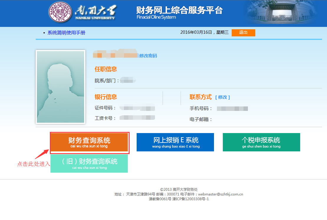 目前,我校教职工2015年度完税证明基本发放完毕,请到所属单位财务人员处领取。教职工在beat365vip官网登录入口取得的收入,可以登录beat365vip官网登录入口财务信息网查询参考(http://cwc.nankai.edu.cn/)。具体查询方法如下: