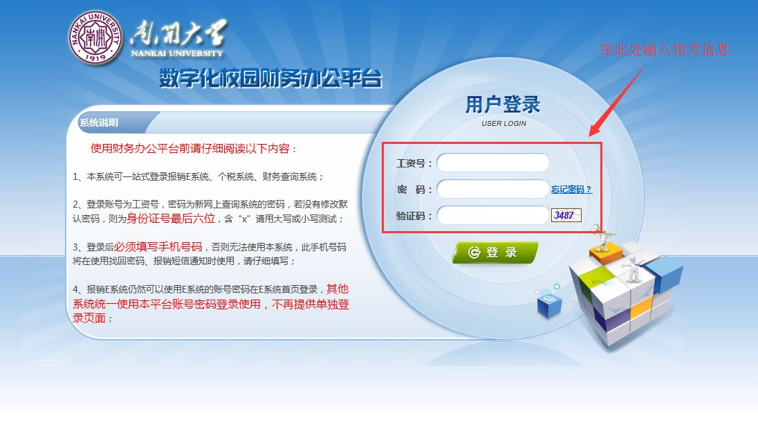 1、直接登录网站http://cwc.nankai.edu.cn/,在网页右下方“业务链接”栏中点击“财务信息平台”,进入登录界面如下图所示: