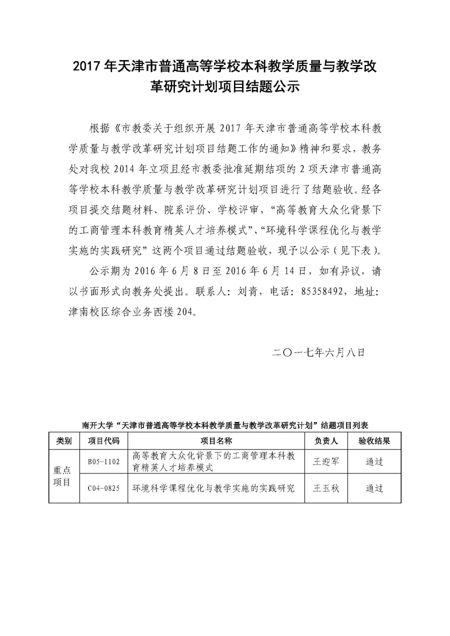 2017年天津市普通高等学校本科教学质量与教学改革研究计划项目结题公示