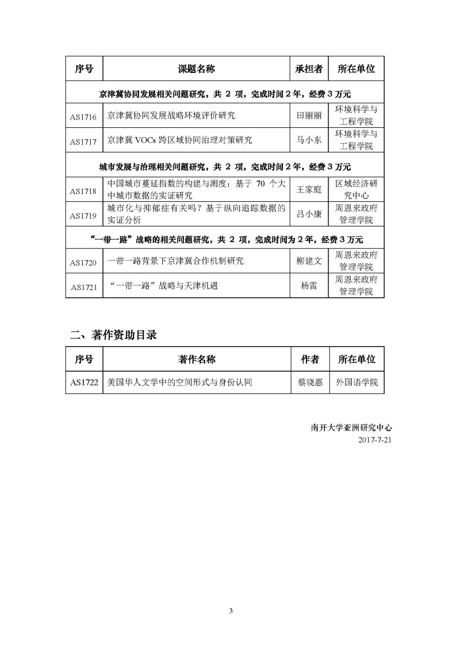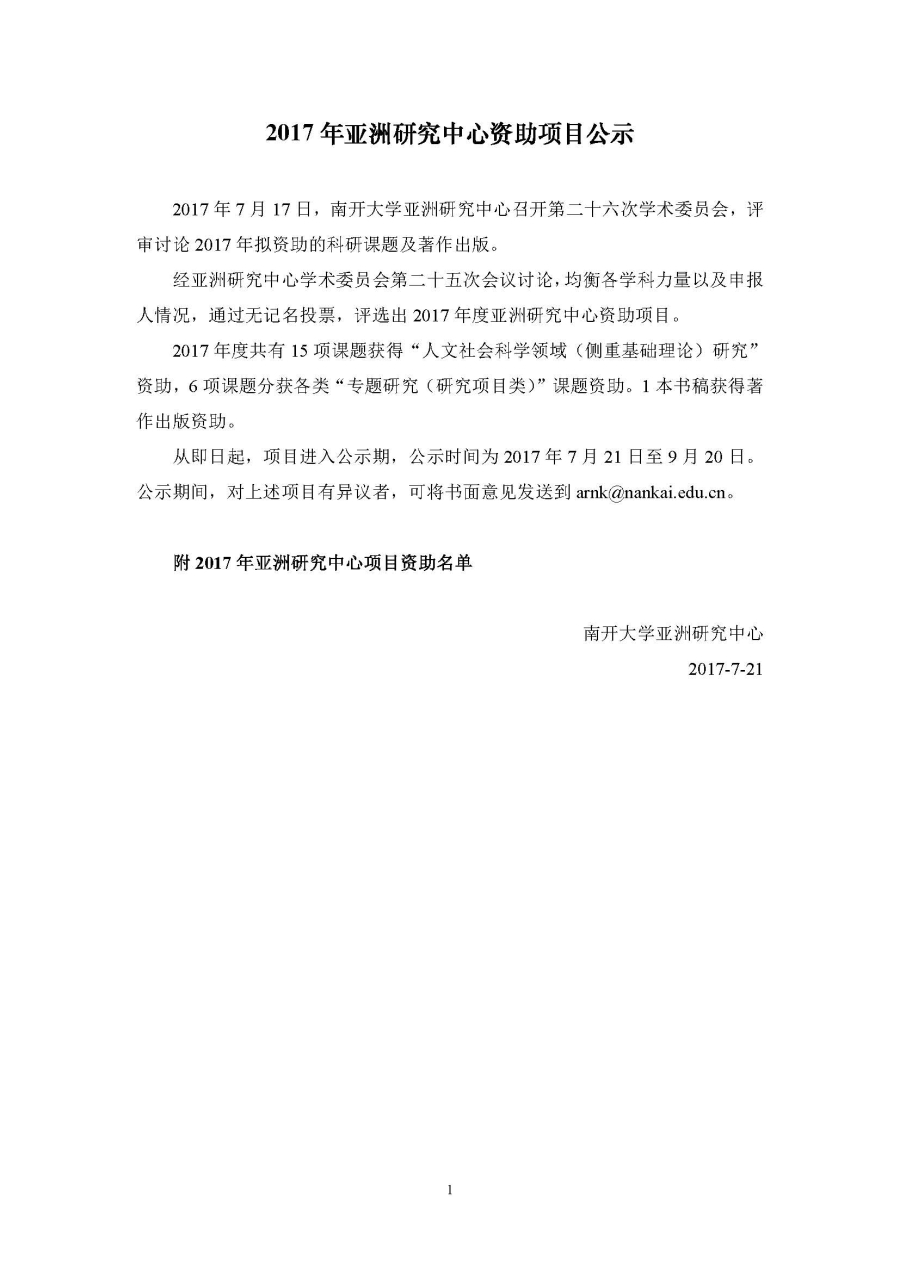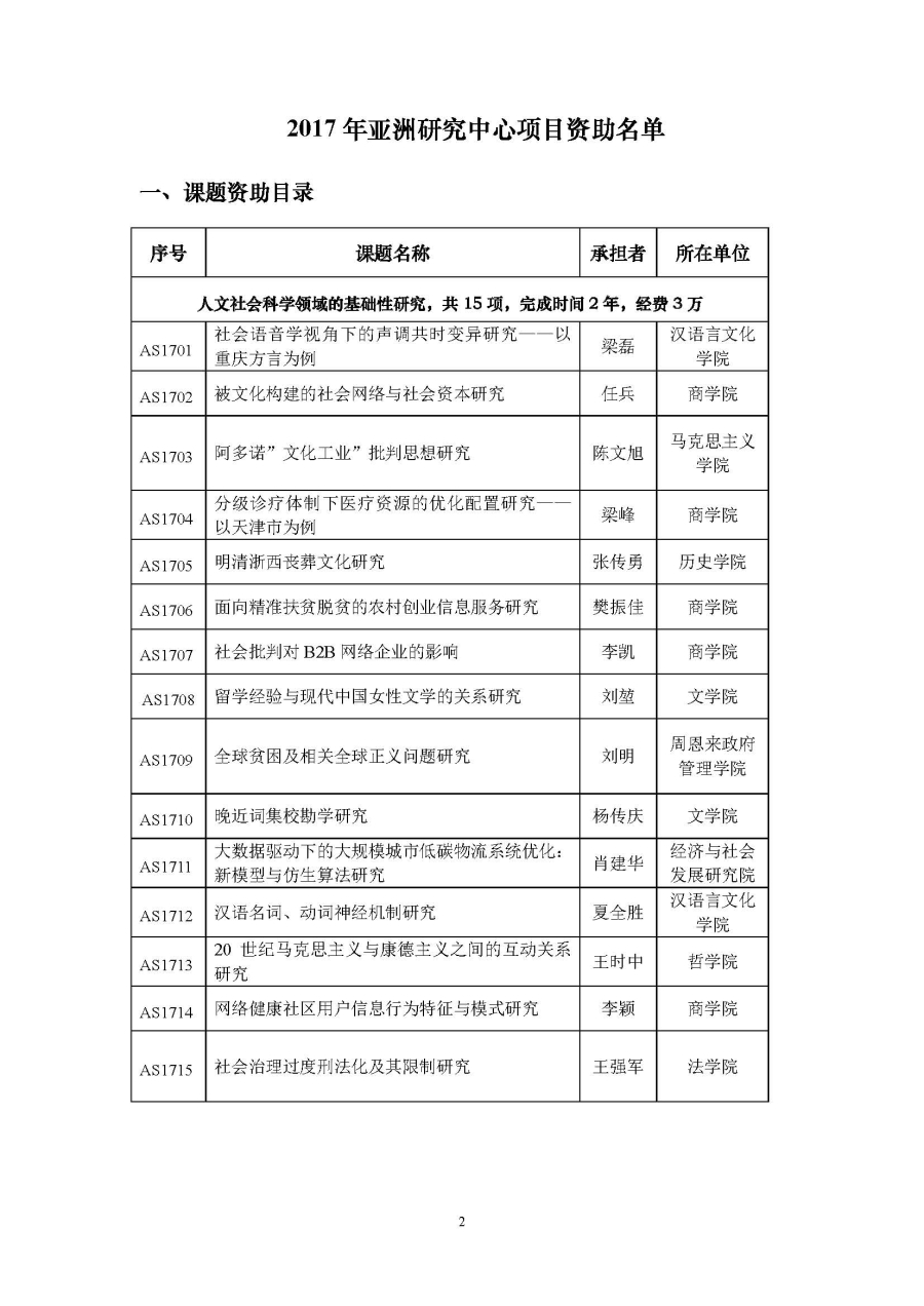 2017年亚洲研究中心资助项目公示