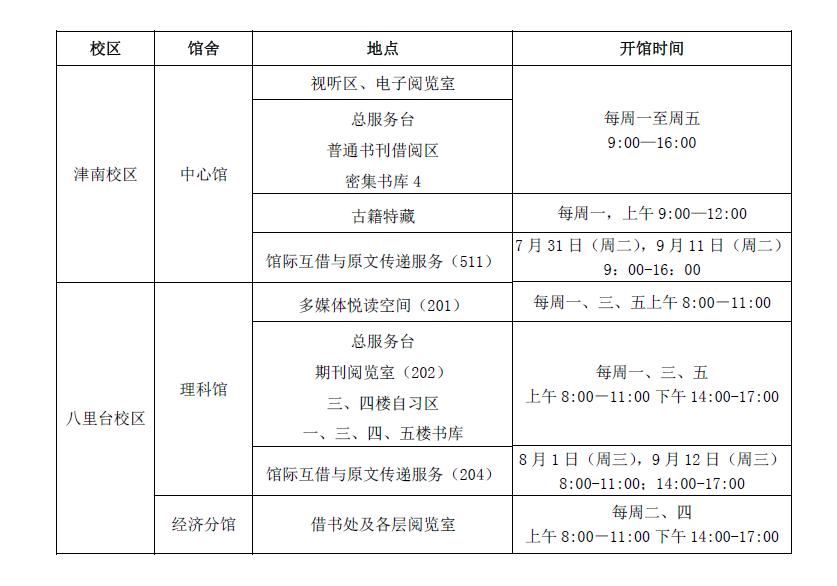 按照学校《关于放暑假的通知》(南办发〔2018〕30号)要求,自7月30日至9月16日放暑假,暑假期间图书馆开馆时间安排如下: