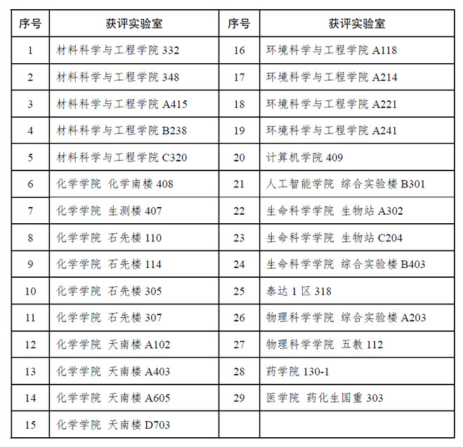 各理工科单位共遴选、推荐参评实验室67间,经学院遴选、推荐,学校实验室检查与应急处置专员实地检查,实验室建设与技术安全委员会专家评审,无记名投票,拟授予以下29间实验室“校级技术安全优秀实验室”称号。具体名单如下:
