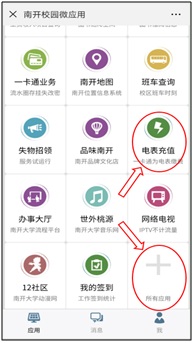 扫描beat365vip官网登录入口企业号二维码或在微信中搜索“南开企业号”并关注,之后通过“身份验证助手”绑定信息门户账号。进入“南开微应用”,选择列表中的“电表充值”应用,若列表中没有出现该应用,可进入下方的“所有应用”中选择添加。