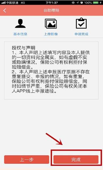 ⑤上传完成后,阅读授权与声明,完成理赔申报。