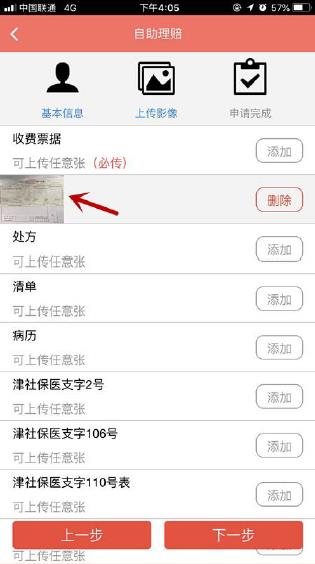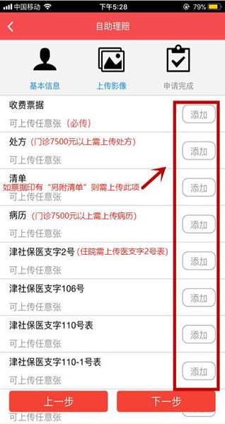 ③上传票据照片:可选择拍照上传和相册上传(通过相册,一次可上传9张照片)两种方式。其中,标红的“必传”项是必须上传项目(如图中“收费票据”项),其他项为选择上传项,按商保报销材料要求选择性上传即可(如有收据上印有“项目过多,另附清单”字样,需要点选“清单”项并上传清单);