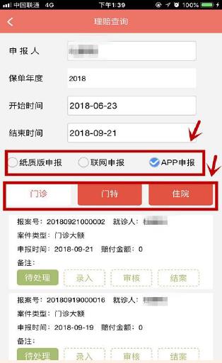 ②支持按申报年度、申报时段、申报途径(APP申报查询)、申报案件类型进行查询。同时,在备注栏显示待处理、录入、审核、结案四种受理状态,绿色填充色块表示当前受理进度;