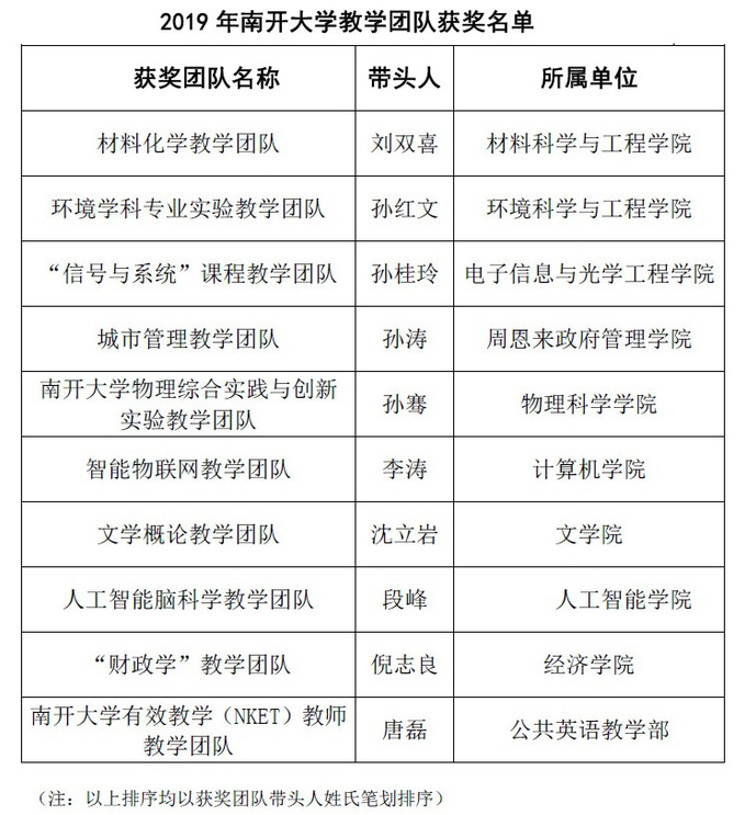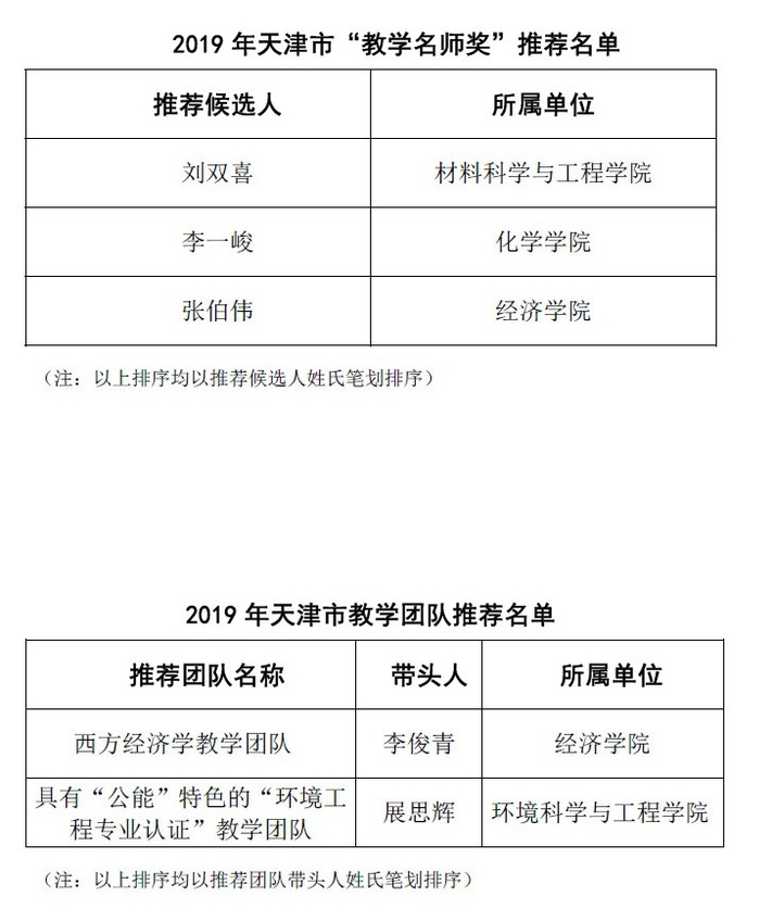 根据《市教委关于认真做好2019年天津市级教学团队和第十三届天津市高等学校教学名师奖申报工作的通知》要求,经各学院推荐,学校本科教学指导委员会评审投票,共评选出2019年beat365vip官网登录入口教学团队10个;经评审拟推荐3人参评市级“教学名师奖”,拟推荐2个教学团队参评市级教学团队。现将名单进行公示,公示期为2019年5月27日至6月2日。在此期间,如对公示人选存在异议,可采取实名方式,将意见以书面形式报送至教务处。
