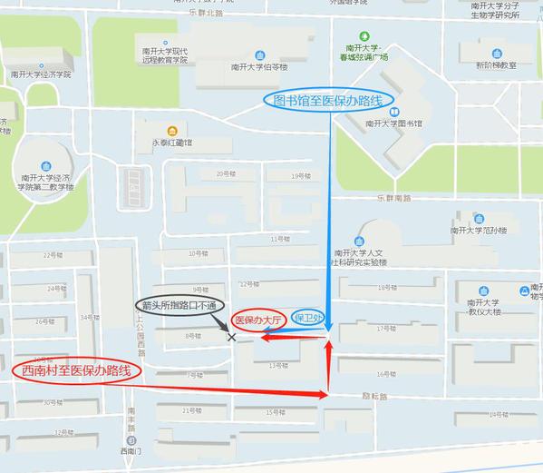 温馨提示:因西南村13号楼西侧建有围墙;请师生经由保卫处东门和西南村13号居民楼之间小路到医保办。