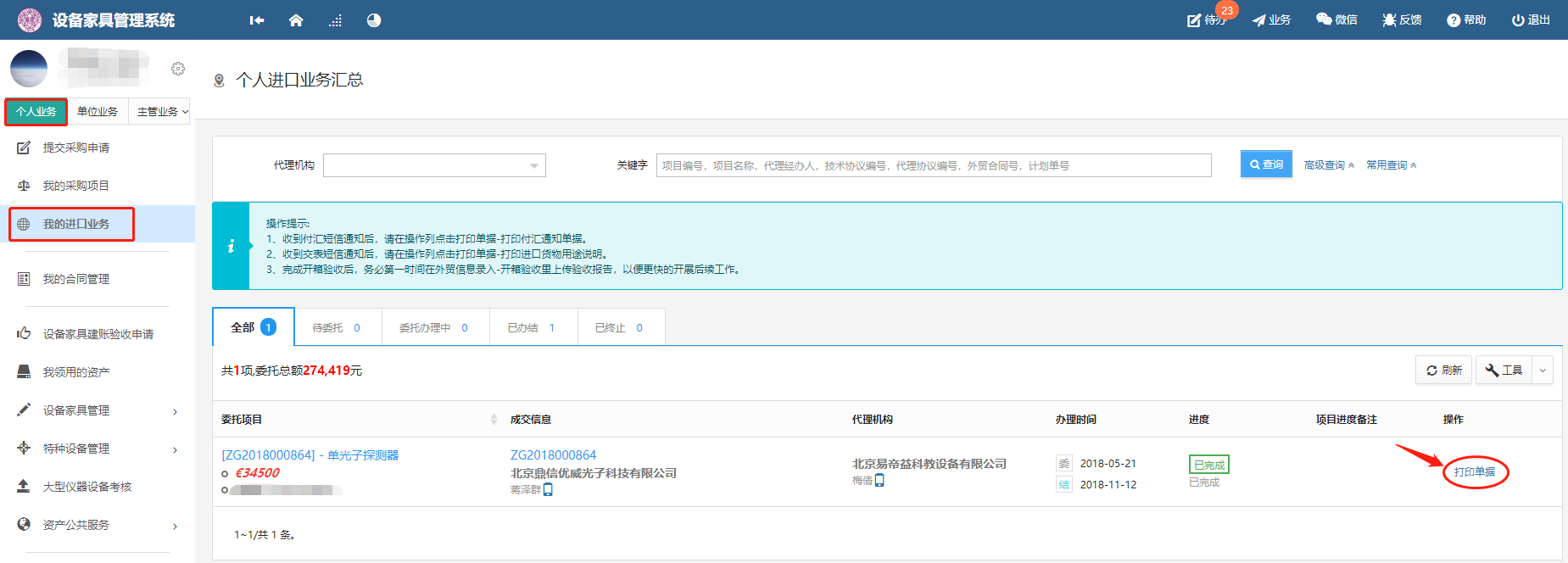 进口设备采购:在设备家具管理系统个人业务”中“我的进口业务”页面,已审核通过的设备最右侧操作栏会显示蓝色的“打印单据”,点击该链接后,可以在后续打开的页面中,打印出《beat365vip官网登录入口进口设备预付汇款通知》(操作说明见附件2)。持该通知和财务处e系统打印的借款单即可前往财务处投递借款,无需再到实验室设备处加盖借款章。