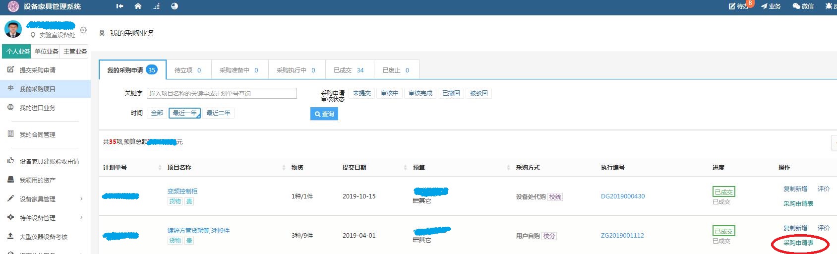 国内设备及家具采购:在设备家具管理系统个人业务”中“我的采购项目”页面,已审核通过的设备家具最右侧操作栏会显示蓝色的“采购申请表”,点击该链接后,可以在后续打开的页面中,打印出《beat365vip官网登录入口采购申请表》(操作说明见附件1)。持该申请表和财务处e系统打印的借款单即可前往财务处投递借款,无需再到实验室设备处加盖借款章。