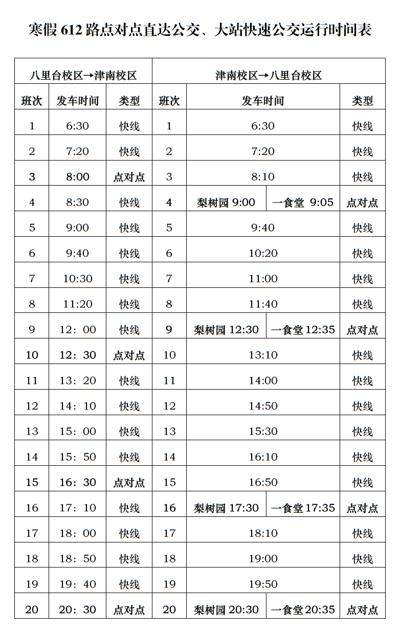 1月14日至2月14日(含周六、日及法定节假日)实行寒假运行方案。寒假期间,在612路点对点直达公交和大站快速公交运行间隙,根据实际需求安排普线公交;津南校区225路校园公交停运。2月15日,612路点对点直达公交、大站快速公交、普线公交及225路校园公交恢复正常运行模式,其中2月15日、16日(周六、日)按工作日方案运行。