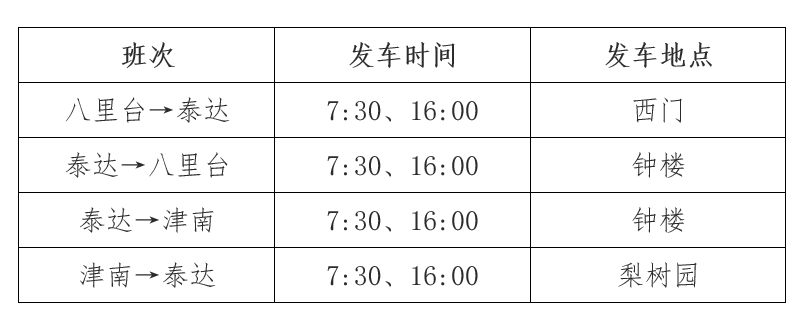 泰达与八里台、津南校区通勤班车7月6日至9月2日实行暑假运行方案,9月3日(星期五)恢复工作日运行,9月4日、5日按照公休日运行。具体安排如下:
