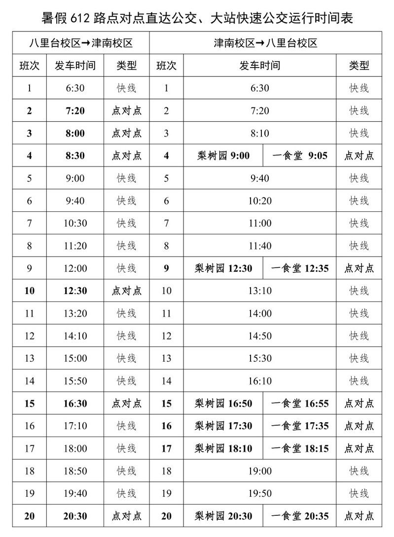 1.泰达与八里台、津南校区通勤班车自2022年6月28日(周二)至8月25日(周四)按照假期班车方案运行,具体班次为: